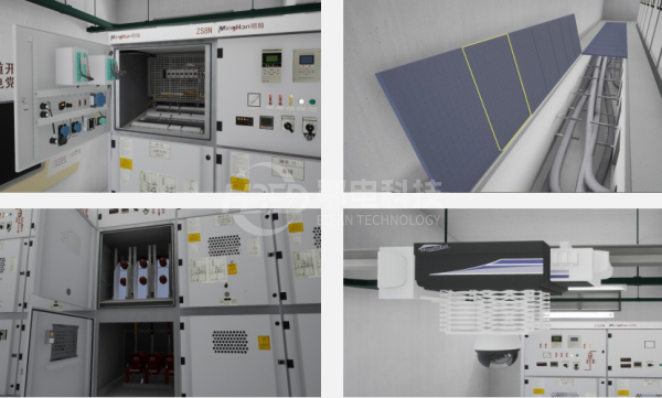 系統(tǒng)對開閉所區(qū)域進行三維全景仿真,并對關(guān)鍵設(shè)備,如銅排測溫,下水道濕度監(jiān)控,進行數(shù)據(jù)可視化三維模擬,另外根據(jù)巡檢機器人現(xiàn)場情況進行實時三維模擬,達到人不在現(xiàn)場,卻如到達現(xiàn)場的效果,高效的進行智能巡檢工作。